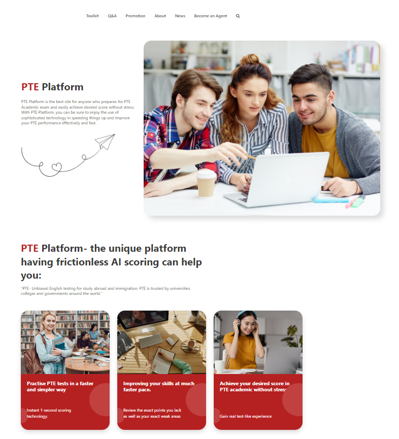 Trên website này, bạn có thể tìm thấy những câu hỏi mới nhất được lấy từ bài thi PTE thật và sẽ được chấm điểm bằng công nghệ AI tương tự như PTE. Kết quả bài làm sẽ có gần như ngay tức thì sau khi hoàn thành. Bạn sẽ nhận được điểm thành phần chi tiết để giúp bạn xác định những điểm yếu mình cần cải thiện