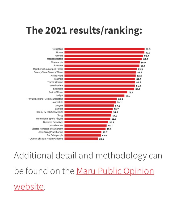 Năm 2022, theo khảo sát gần nhất của Maru Public Opinion, đứng đầu danh sách này là Chuyên gia Y tế có tay nghề cao thường thấy ở các trường hợp cấp cứu. Lính cứu hỏa, Y tá, Nông dân,…vẫn luôn đứng ở các vị trí cao nhất trong bảng đánh giá công việc được tôn trọng nhất của Canada.
