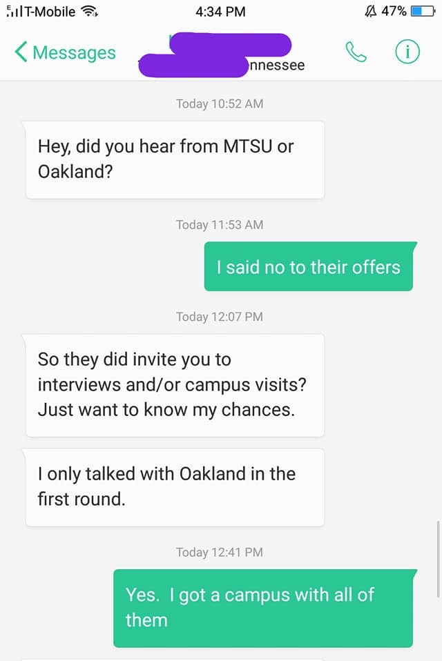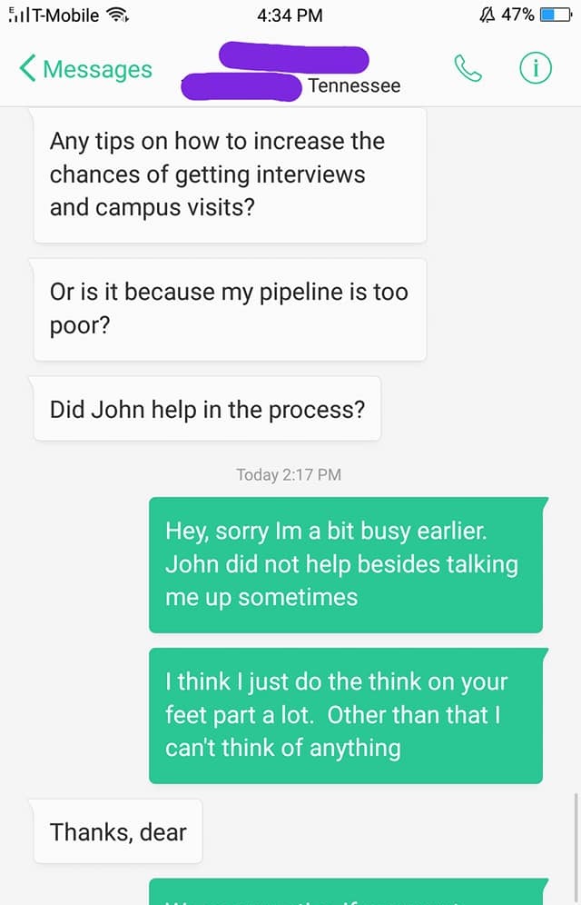 Đoạn chat trong hình là bạn cùng khóa với mình nhắn để hỏi xem mình đã đi phỏng vấn trực tiếp (vòng 2 hoặc 3) cho công việc ở một số trường mà bạn ấy quan tâm chưa. Mình trả lời là mình đã từ chối Thư mời nhận việc của họ rồi. Bạn ấy thực sự hoảng khi mình có phỏng vấn với tất cả những trường đó mà bạn ấy không có nên còn hỏi mình “John (giáo sư hướng dẫn của mình, cũng là trưởng khoa) có giúp gì không?” Mình mới đáp lại là chi thoảng giáo an ủi mình tí thôi.