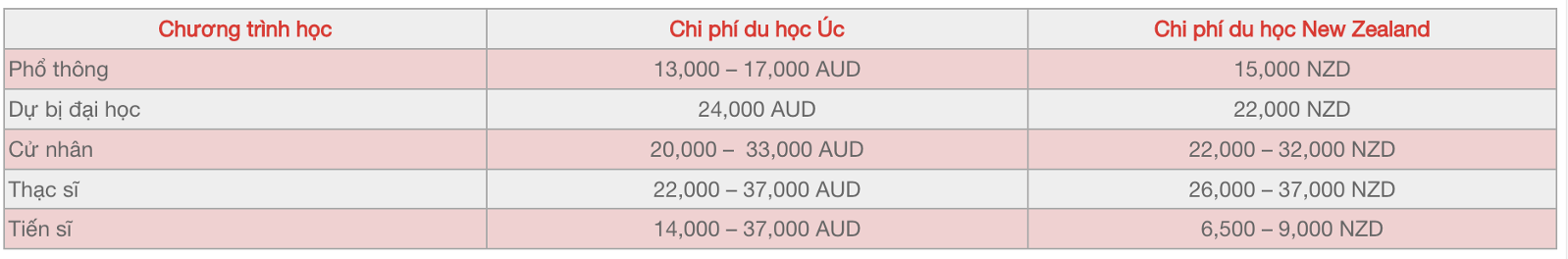 Dưới đây là bảng so sánh tham khảo chi phí du học tại Úc và New Zealand: