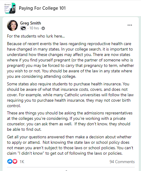 Trên trang “Paying for College 101,” một diễn đàn Facebook với gần 150.000 thành viên dành cho các phụ huynh Mỹ trao đổi về kế hoạch học đại học của con cái, một loạt người đăng bài viết bày tỏ sự phản đối hoặc ủng hộ đối với thực tại mới này. Một số phụ huynh cũng đưa ra lời khuyên thực tiễn như post trong hình, mà Khương tạm dịch ngắn như sau: