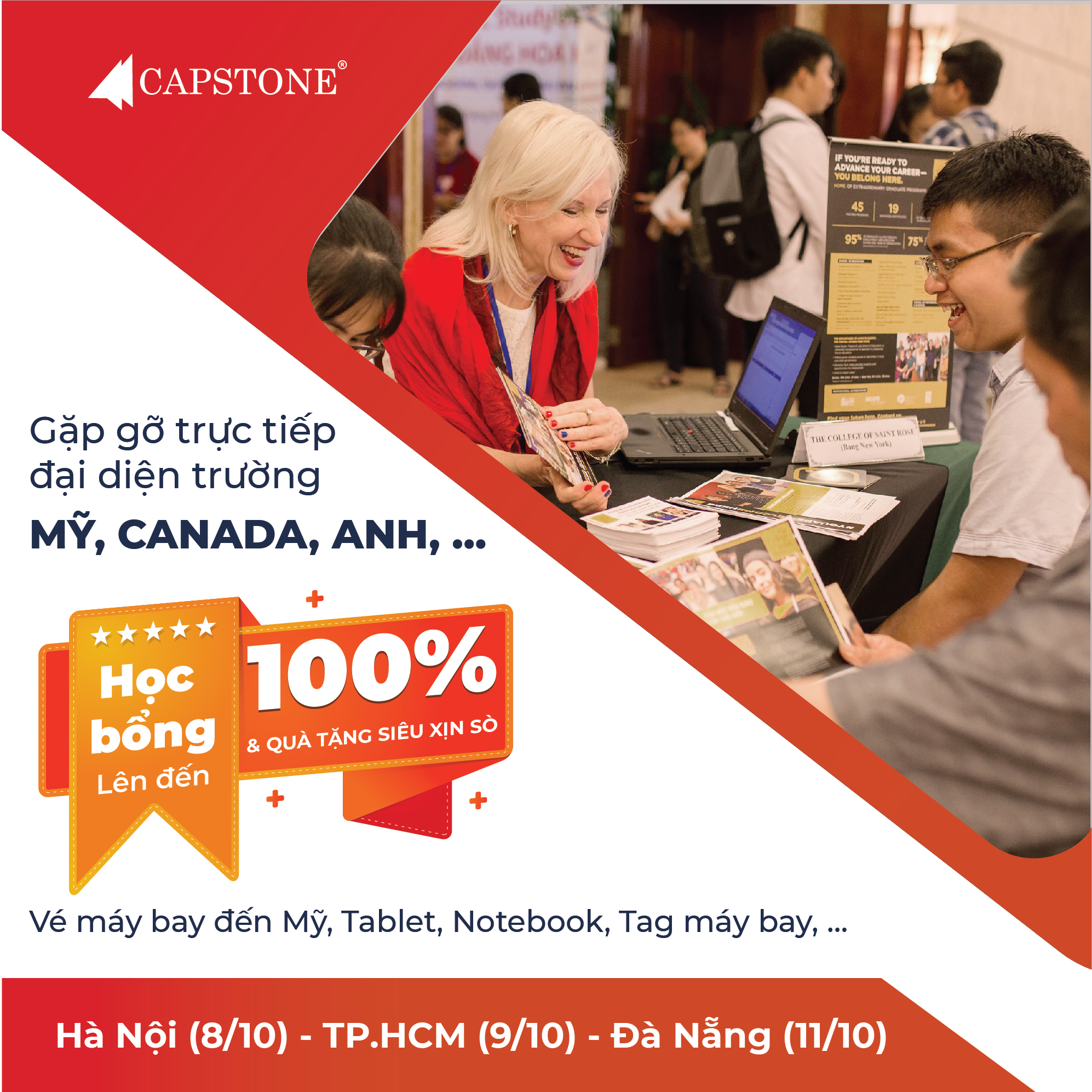 Đồng hành cùng chúng tôi để thực hiện hóa giấc mơ du học của bạn, được tư vấn trực tiếp 1-1 miễn phí cùng các cố vấn giáo dục tại Capstone với hơn 13 năm kinh nghiệm trong lĩnh vực du học. Triển lãm diễn ra tại 3 thành phố lớn: